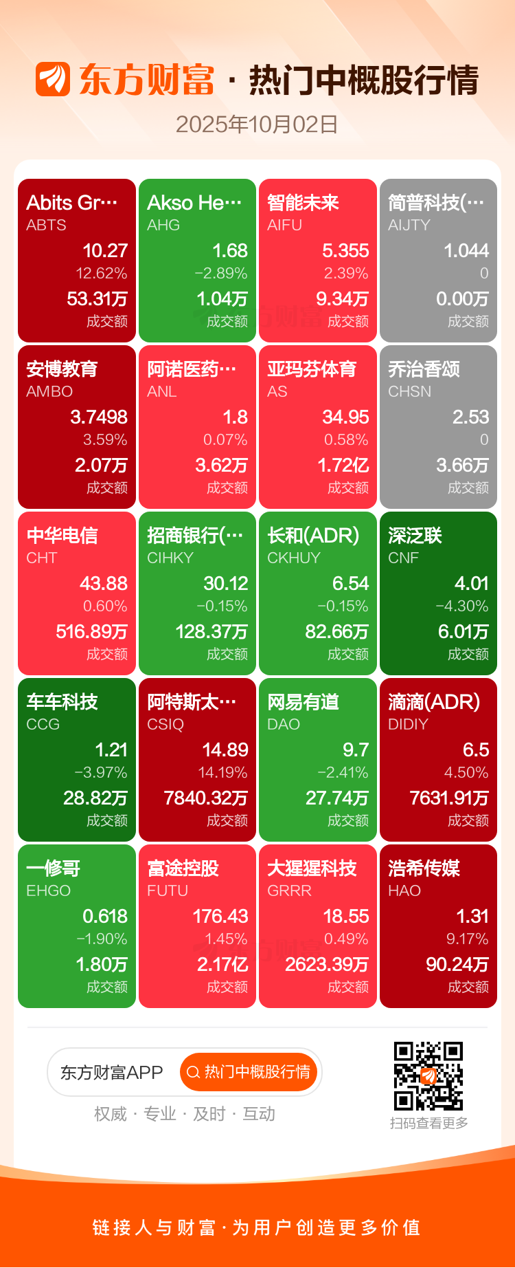 Abits Group Inc涨12.62%,Akso Health Group ADR跌2.89%,智能未来涨2.39%,简普科技(ADR)平收,安博教育涨3.59%,阿诺医药集团涨0.07%,亚玛芬体育涨0.58%,乔治香颂平收,中华电信涨0.60%,招商银行(ADR)跌0.15%。