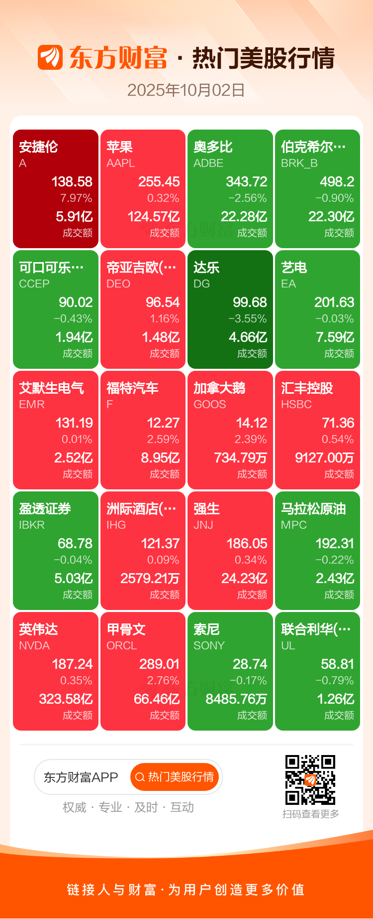 安捷伦涨7.97%,苹果涨0.32%,奥多比跌2.56%,伯克希尔哈撒韦-B跌0.90%,可口可乐欧洲太平洋合伙(US)跌0.43%,帝亚吉欧(US ADR)涨1.16%,达乐跌3.55%,艺电跌0.03%,艾默生电气涨0.01%,福特汽车涨2.59%。