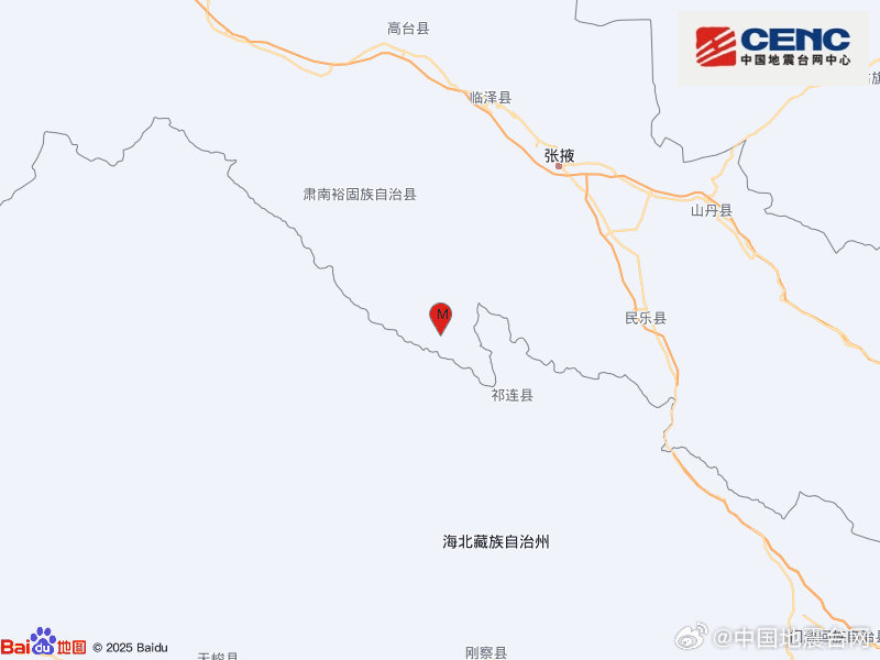 甘肃张掖市肃南县发生3.2级地震,震源深度10千米