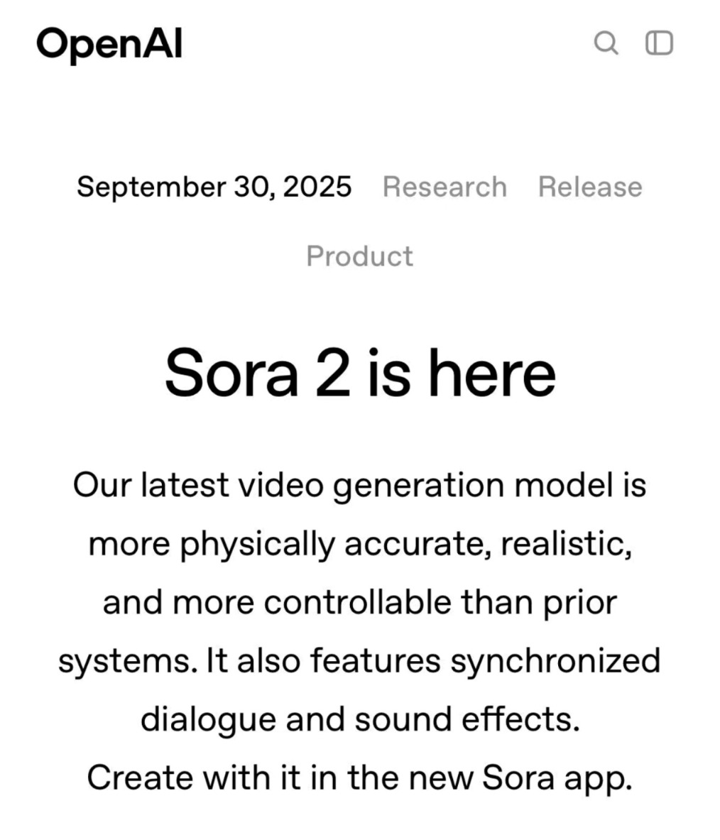 OpenAI发布视频生成模型Sora 2
