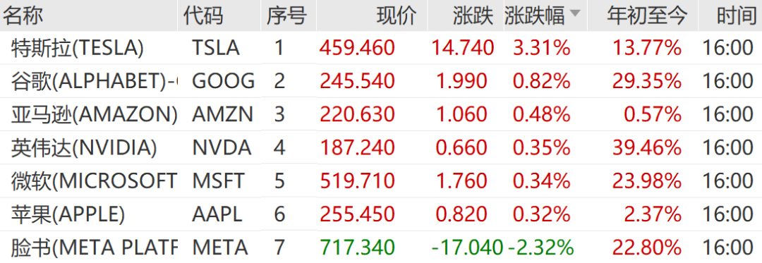 万得美国科技七巨头指数涨0.39%。特斯拉涨3.31%,谷歌涨0.82%,亚马逊涨0.48%,领涨美国科技七巨头。