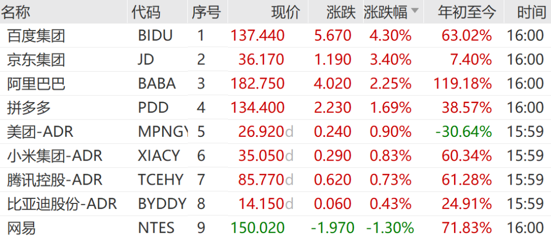 个股方面,陆控涨超8%,唯品会涨超5%,晶科能源涨近5%,世纪互联涨逾4%,百度集团涨超4%,亚朵跌逾3%,爱奇艺跌近2%,BOSS直聘跌超2%,禾赛科技跌近2%,网易跌超1%。