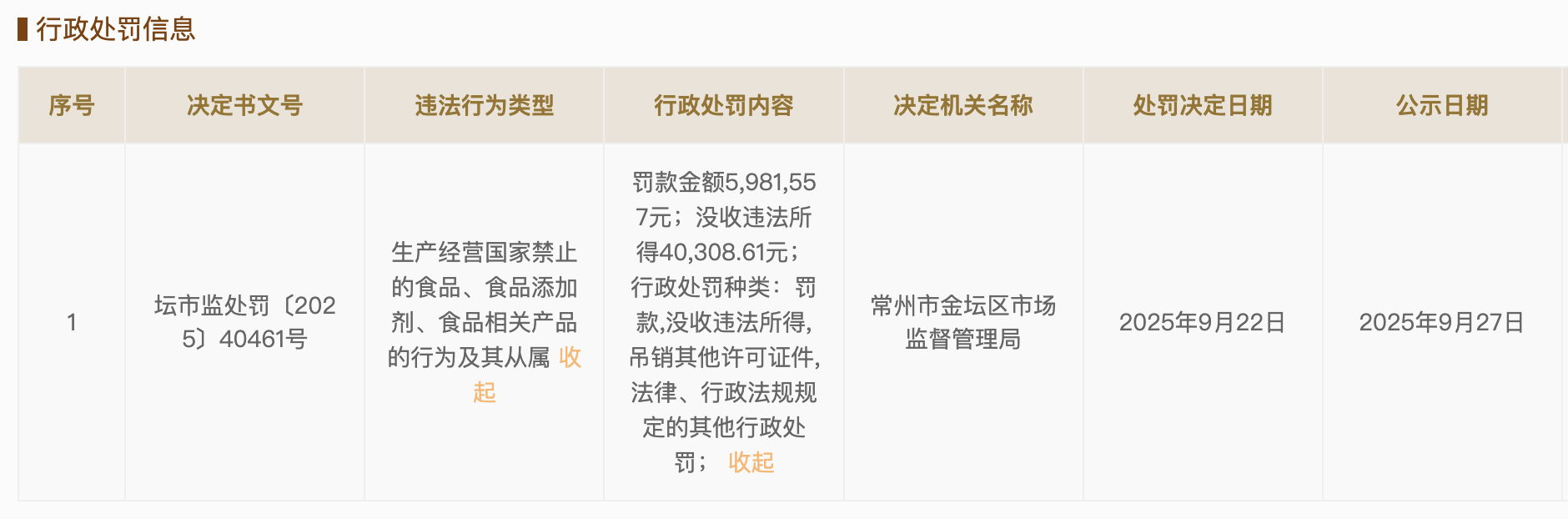 国家企业信用信息公示系统显示,近日常州一壶醇食品科技有限公司(简称“一壶醇食品”)因生产经营国家禁止的食品被常州市金坛区市场监管局罚没6021865.61元。