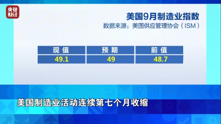 经济数据面上,美国供应管理协会(ISM)周三公布的数据显示,美国9月ISM制造业PMI指数为49.1,连续第七个月处于收缩区间,当月新订单数回落,11个行业的制造活动出现萎缩。