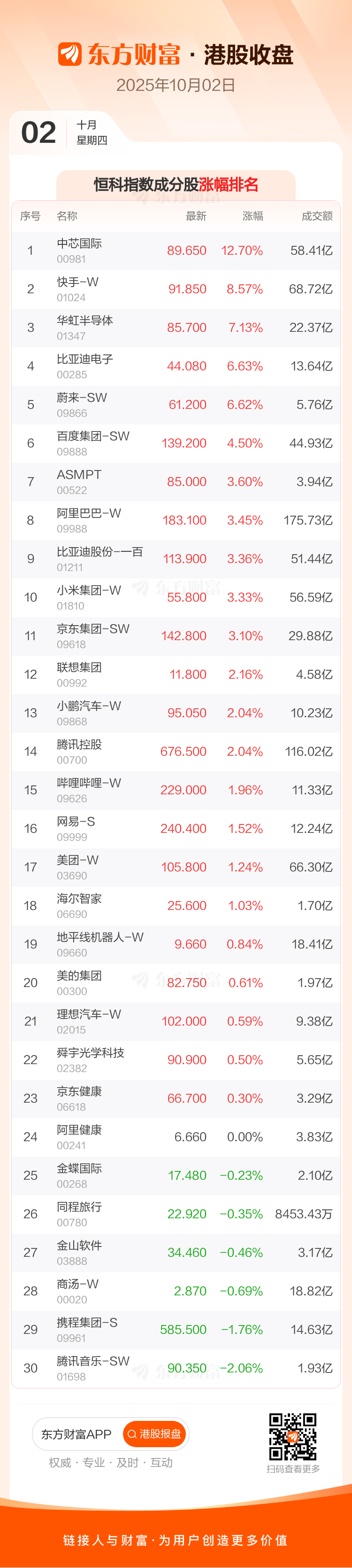 10月2日港股收盘:恒指涨1.61% 中芯国际领涨成分股