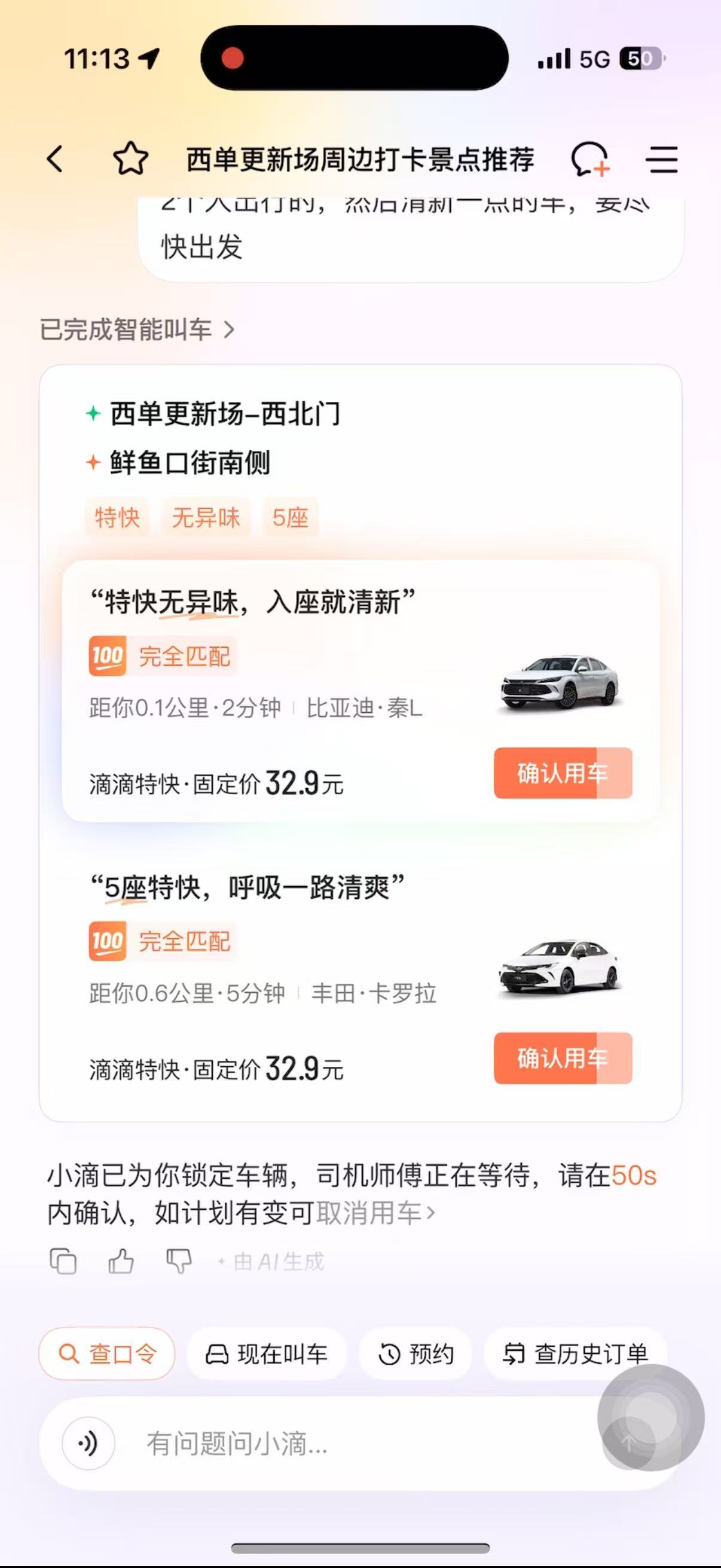 在另一次测试中,我尝试提出更模糊的需求:“我现在在西单,给我推荐附近适合旅游打卡的景点,并打一辆老司机开的,空气清新的车。”“小滴”随即推荐了距离西单约2公里的故宫博物院和前门等经典的北京打卡景点,并为我匹配了两款车型:一款是“特快无异味,距离0.1公里”的轿车,另一款是“距离0.6公里的5座特快,呼吸一路清爽”。