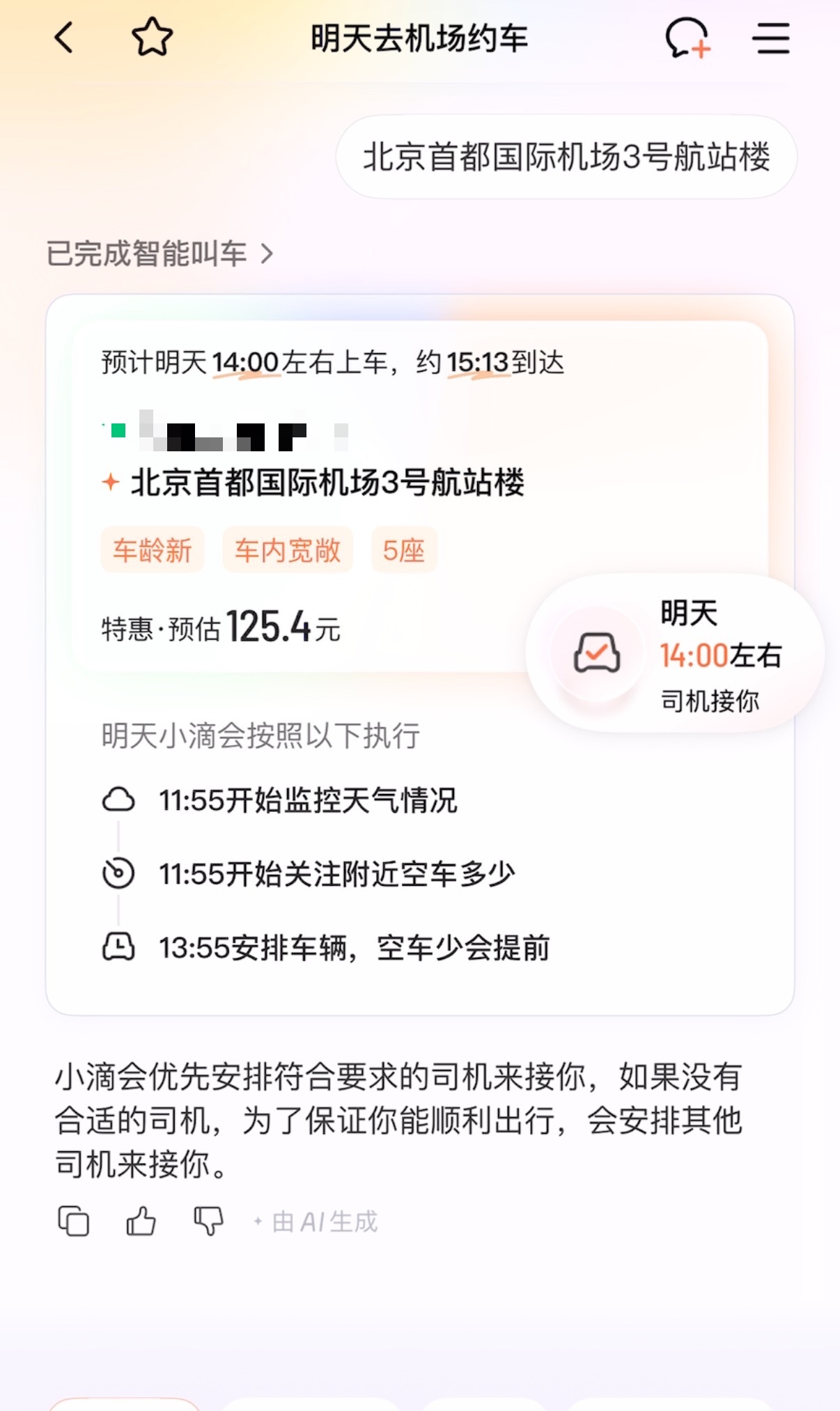 与常规打车流程不同,在我提出了我的预约出行要求和用车场景后,“小滴”并未立即派单,而是经过约30秒的智能分析和数据处理后生成了一份完整的出行方案:建议下午2点左右出发,系统将在11:55起监控天气,13:55安排车辆,若空车紧张则会提前调度。
