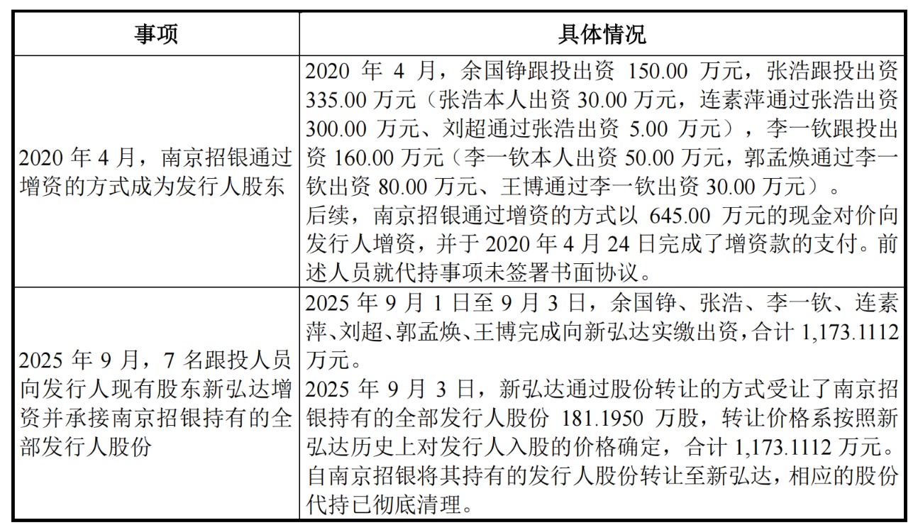2025年9月,7名跟投人员向公司现有股东新弘达增资并承接南京招银持有的全部公司股份。