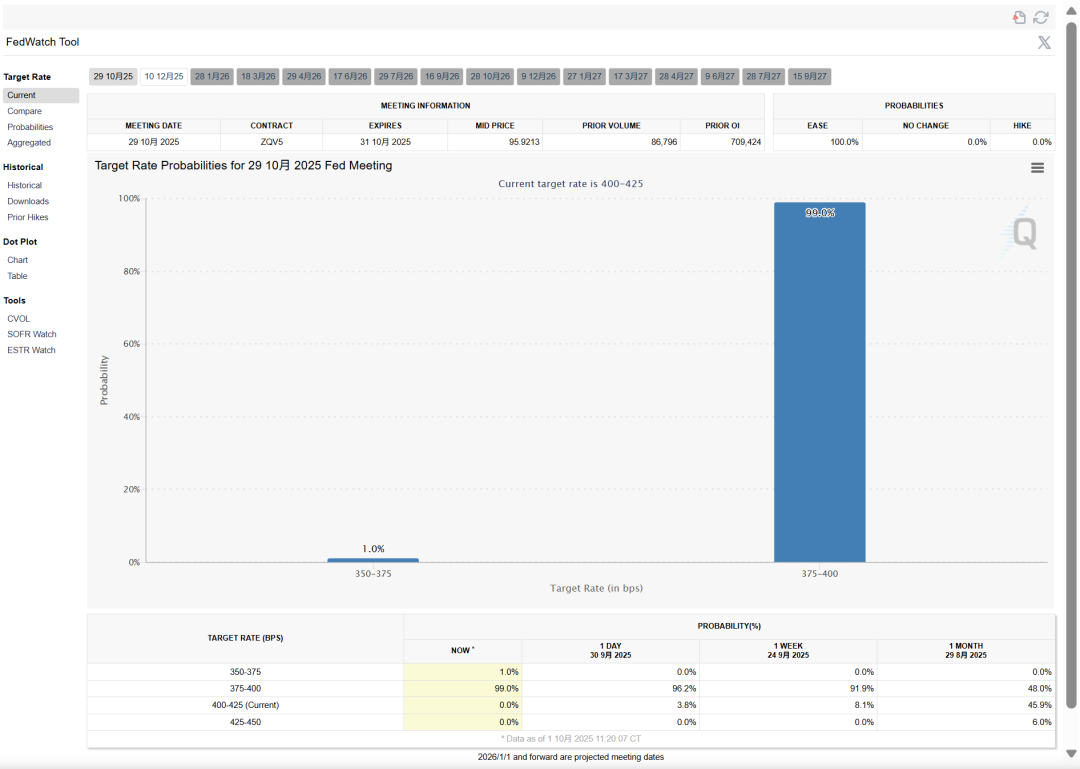 宏观面上,美联储10月降息预期正由于美国政府停摆而得到进一步加强。据CME“美联储观察”,目前美联储10月降息的概率已经升至100%,降息25个基点的概率为99%,而降息50基点的概率为1%。12月份再次降息的可能性为88%。两者都比政府停摆开始时更高。