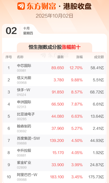 10月2日亚洲交易时段,港股、韩股芯片股亦集体大涨,SK海力士一度大涨超12%,港股中芯国际收盘大涨12.7%,华虹半导体涨7.13%。