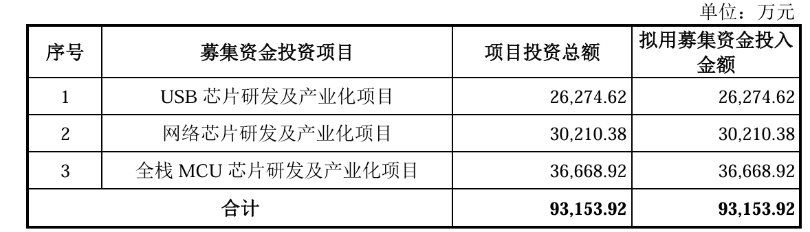 沁恒微本次IPO计划募资9.32亿元,分别用于USB 芯片研发及产业化项目、网络芯片研发及产业化项目、全栈 MCU 芯片研发及产业化项目。