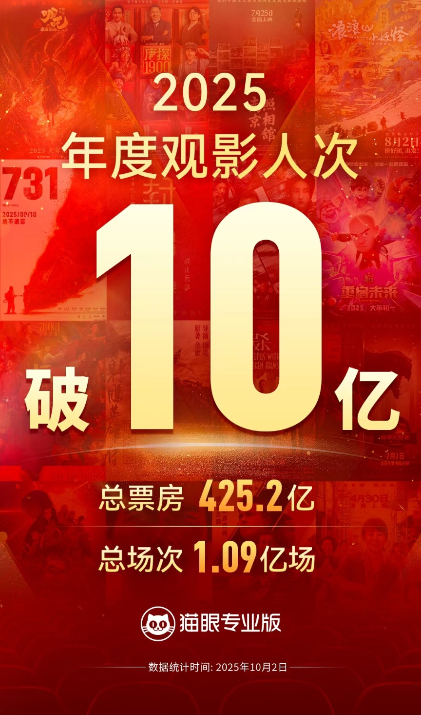 据猫眼专业版数据,截至2025年10月2日15时30分,2025年度总观影人次已破10亿,总票房达425.2亿,总场次达1.09亿场,平均票价42.5元。目前,2025年度总票房已超去年全年。