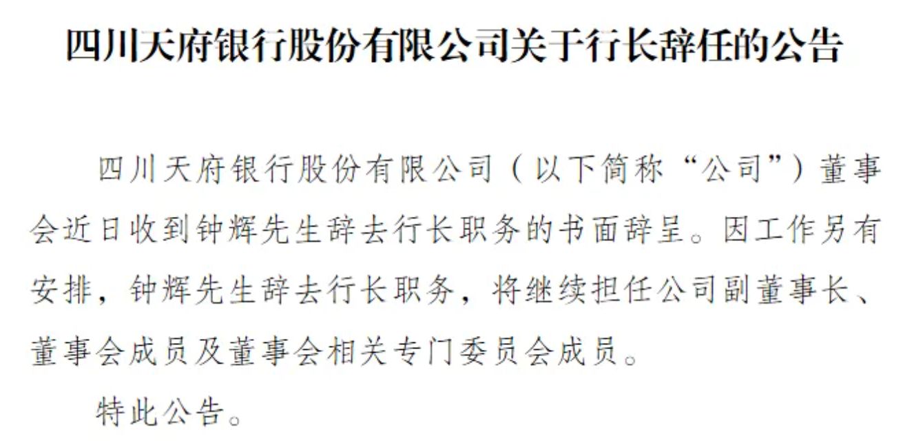 近日,四川天府银行发布公告,该行董事会收到钟辉辞去行长职务的书面辞呈。