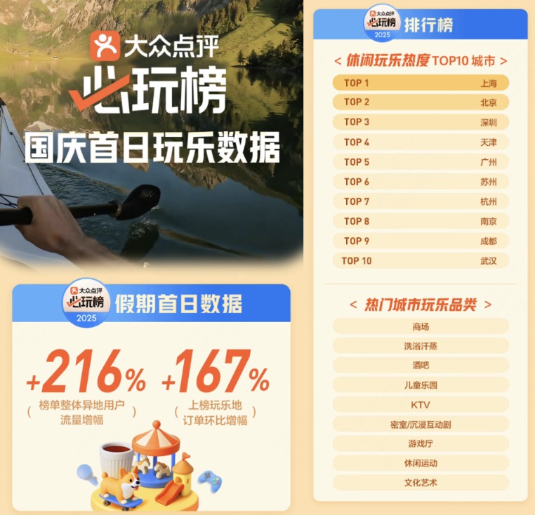 “本地深度游”趋势下,覆盖“吃住玩”多场景的大众点评三大“必系列”榜单热度同步攀升。数据显示,10月1日,大众点评“必玩榜”异地用户流量环比增长216%,上榜玩乐地订单量环比增幅超167%。