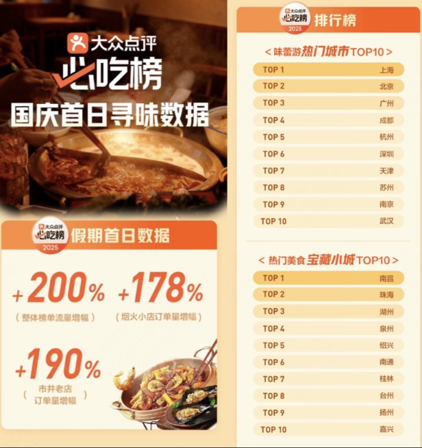 10月2日,记者获悉,大众点评“必吃榜”发布国庆假期首日“寻味”数据。数据显示,假期第一天,“必吃榜”榜单流量环比上月增长近两倍,其中,上榜小店流量增幅超125%、订单量涨超178%,上榜老店流量涨超130%、订单量涨超190%;上海、北京、广州、成都、杭州、深圳、天津、苏州、南京、武汉为“味蕾游”热门城市TOP10,南昌、珠海、湖州、泉州、绍兴、南通、桂林、台州、扬州、嘉兴为热门美食“宝藏”小城TOP10。