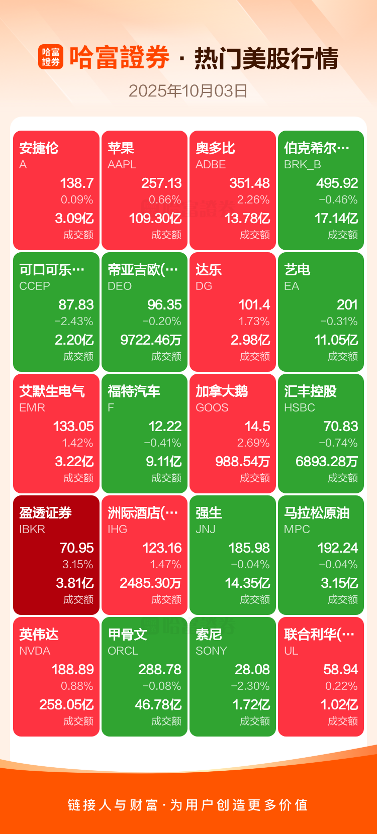 安捷伦涨0.09%,苹果涨0.66%,奥多比涨2.26%,伯克希尔哈撒韦-B跌0.46%,可口可乐欧洲太平洋合伙(US)跌2.43%,帝亚吉欧(US ADR)跌0.20%,达乐涨1.73%,艺电跌0.31%,艾默生电气涨1.42%,福特汽车跌0.41%。