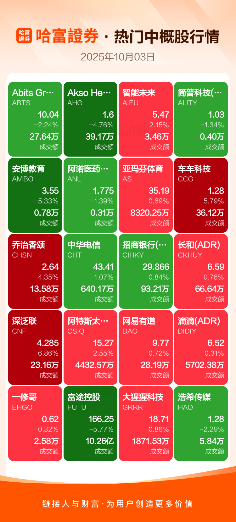Abits Group Inc跌2.24%,Akso Health Group ADR跌4.76%,智能未来涨2.15%,简普科技(ADR)跌1.34%,安博教育跌5.33%,阿诺医药集团跌1.39%,亚玛芬体育涨0.69%,车车科技涨5.79%,乔治香颂涨4.35%,中华电信跌1.07%。