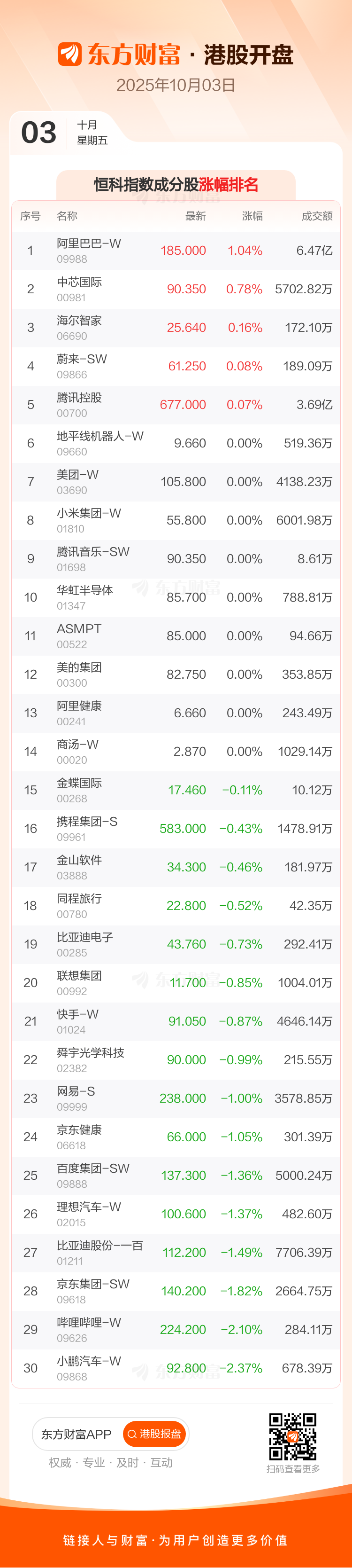 10月3日港股开盘:恒指低开0.24% 紫金矿业领跌成分股