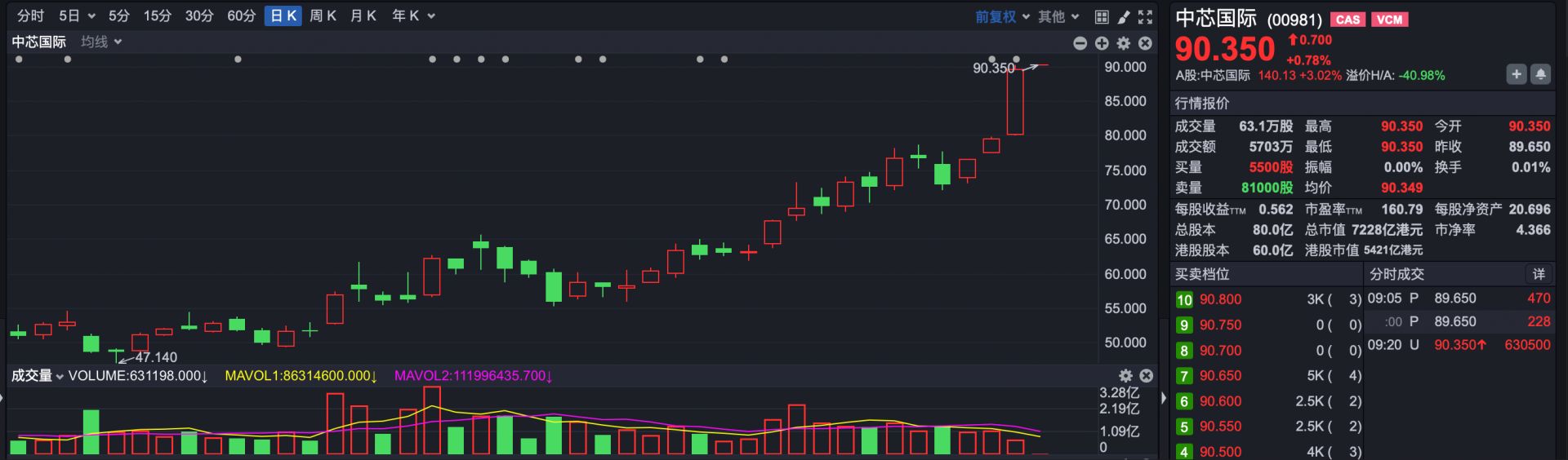 焦点公司方面,继昨日大涨12%之后,中芯国际(00981.HK)今日再度高开0.78%,报90.35港元,继续创出历史新高。