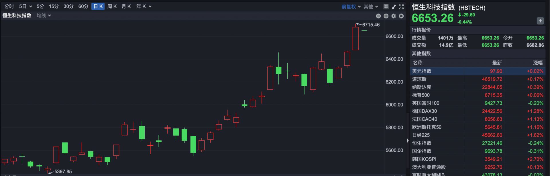 恒生科技指数报6653.26点,下跌29.60点,跌幅0.44%。