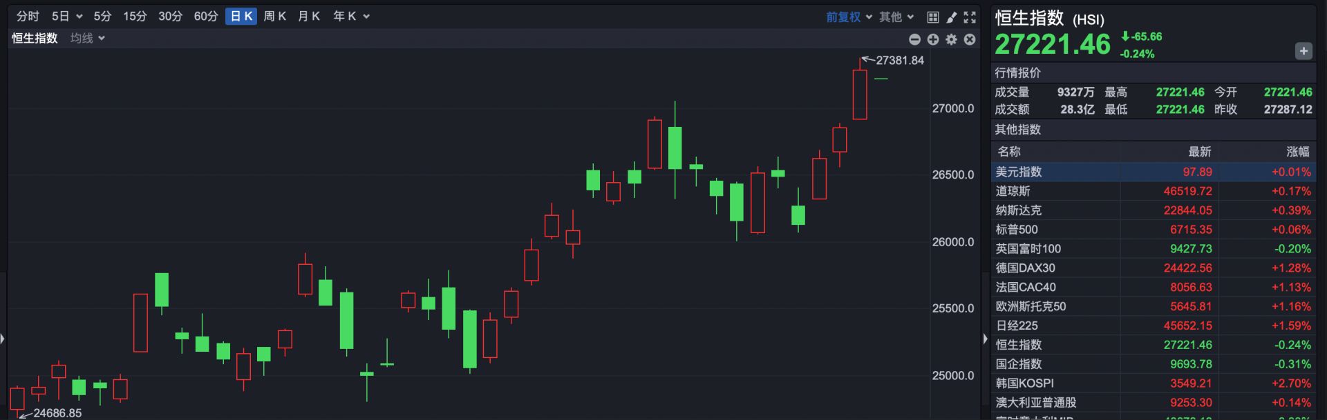 截至发稿,恒生指数报27221.46点,下跌65.66点,跌幅0.24%。