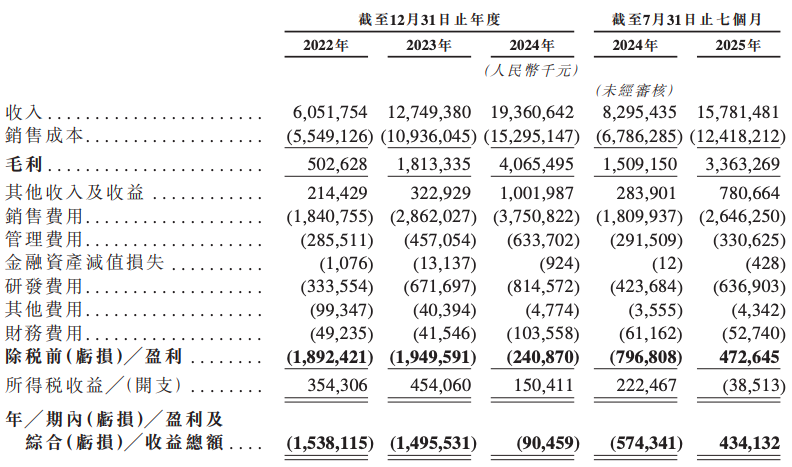 得益于销量的高速增长,岚图汽车收入保持快速增长。报告期内,公司实现营业收入分别为60.5亿元、127.5亿元、193.6亿元、157.8亿元,2022年~2024年复合年增长率为78.9%,2025年前7个月同比增速为90.2%。