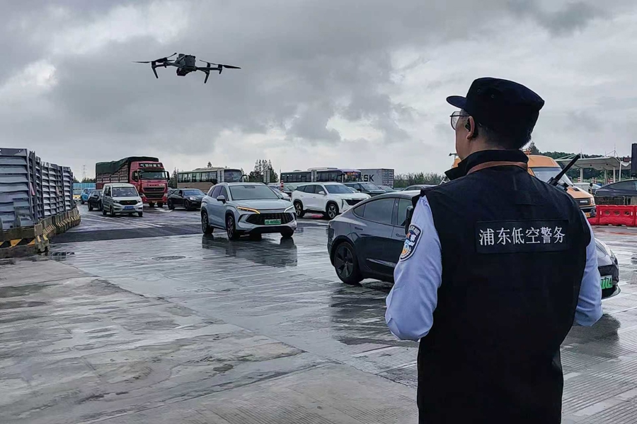 G40沪陕高速是节日出行流量大的易堵点。为保障道路通行秩序和交通安全,浦东公安分局交管支队会同低空警务专班提前部署,在重点路段启用无人机开展空中巡查。