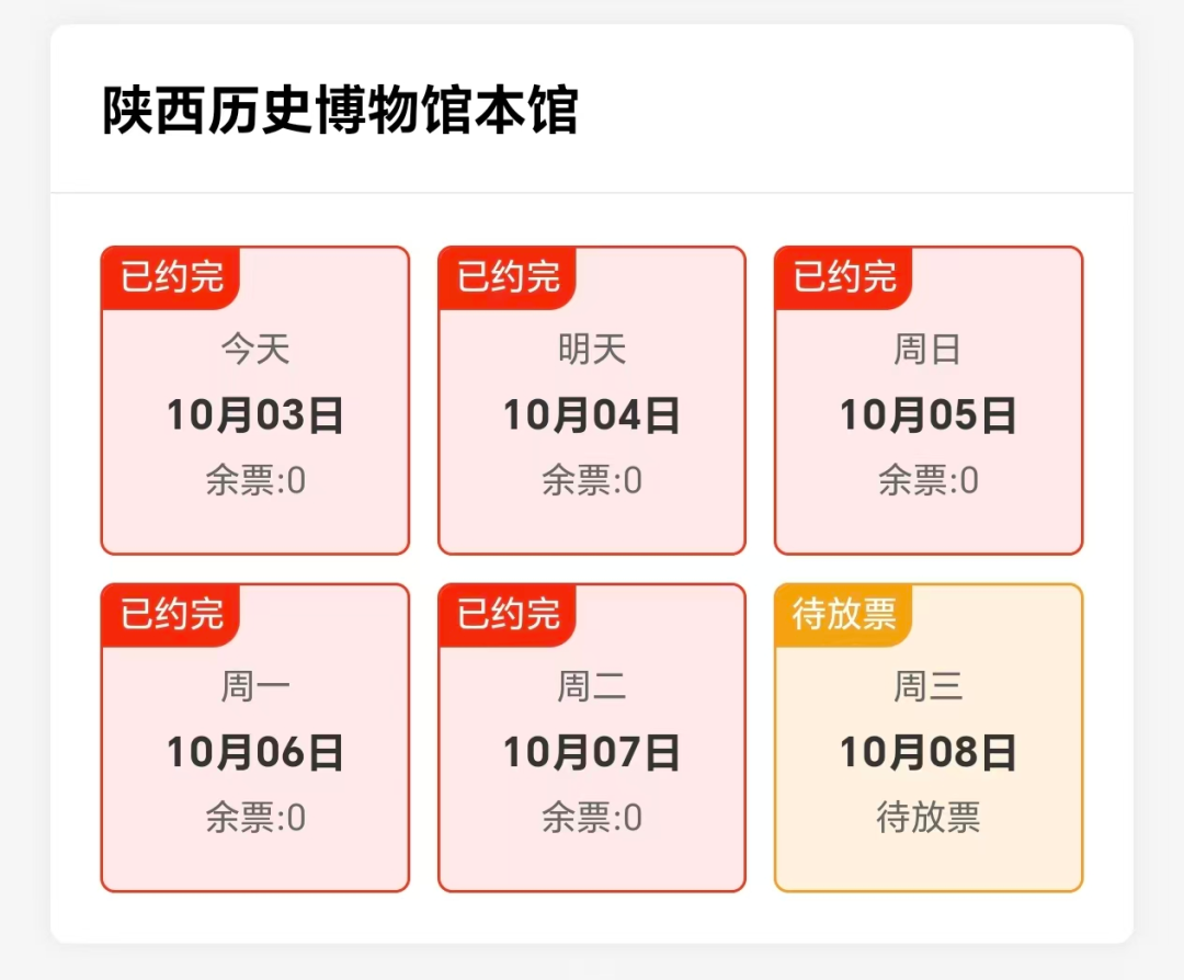 直至中秋前后,热门博物馆的参观名额大多处于约满状态。中国国家博物馆、故宫博物院、陕西历史博物馆、景德镇中国陶瓷博物馆等热门博物馆一票难求,如国博10月8日和陕博10月7日前可预约时段内的门票均已约满。