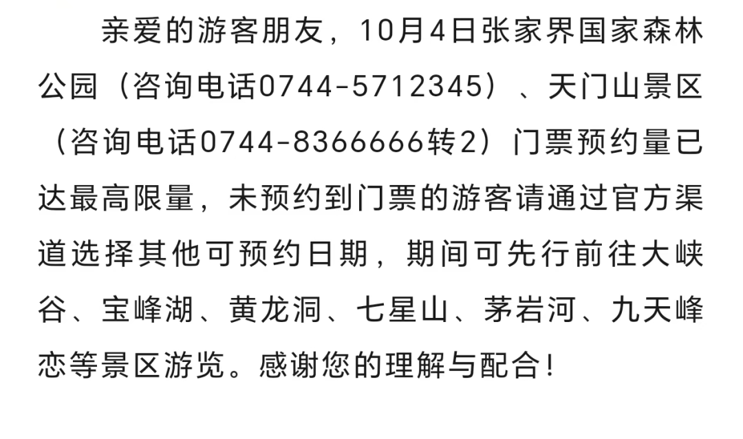 安徽黄山景区2日至6日的门票预约已满,游客可选择候补购票。张家界市应急办、张家界市文旅局公告,10月4日张家界国家森林公园、天门山景区门票已约满。