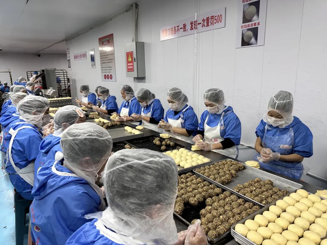 在村中的“印奶奶”月饼厂,厂区门口工人们正将成箱月饼装上货车。记者换上工装后,经过严格消毒,进入了月饼加工车间。分面、分酥、开酥、分面剂、包馅……上百名工人正在紧张忙碌着。