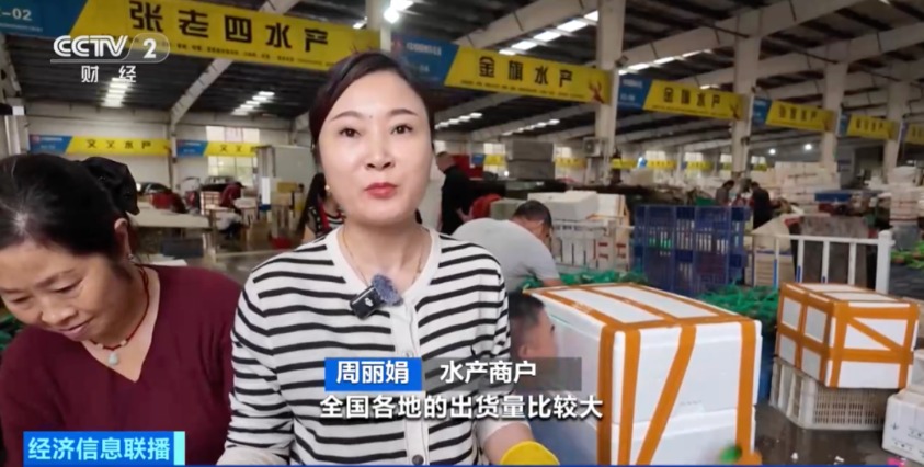 水产商户周丽娟:全国各地的出货量比较大,我们这次发往全国各地的货,有上海、江苏、浙江……到处都有,在这个节日期间,每天出货量有3000斤左右。