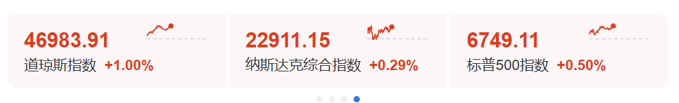 由30只成分股构成的道琼斯工业平均指数上涨超400点,涨幅1%。标普500指数上涨0.5%,纳斯达克综合指数微涨约0.3%。小盘股为主的罗素2000指数大涨1.4%。这四大指数均创下历史新高。