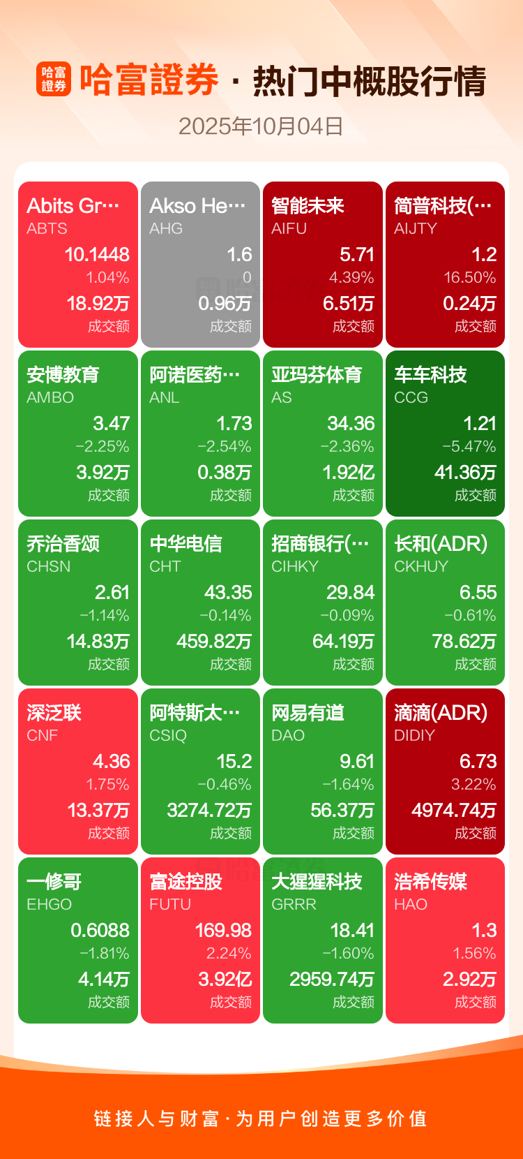 Abits Group Inc涨1.04%,Akso Health Group ADR平收,智能未来涨4.39%,简普科技(ADR)涨16.50%,安博教育跌2.25%,阿诺医药集团跌2.54%,亚玛芬体育跌2.36%,车车科技跌5.47%,乔治香颂跌1.14%,中华电信跌0.14%。
