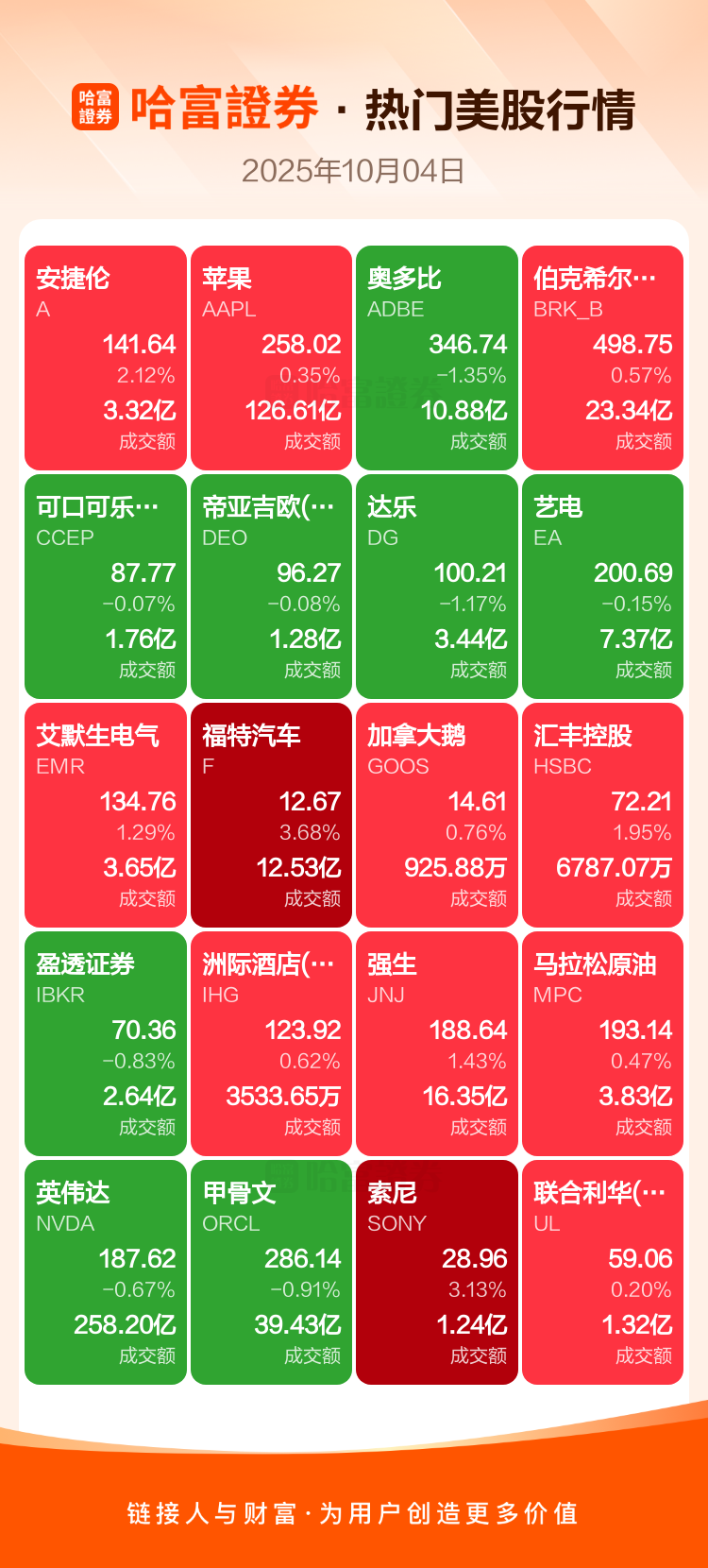 安捷伦涨2.12%,苹果涨0.35%,奥多比跌1.35%,伯克希尔哈撒韦-B涨0.57%,可口可乐欧洲太平洋合伙(US)跌0.07%,帝亚吉欧(US ADR)跌0.08%,达乐跌1.17%,艺电跌0.15%,艾默生电气涨1.29%,福特汽车涨3.68%。