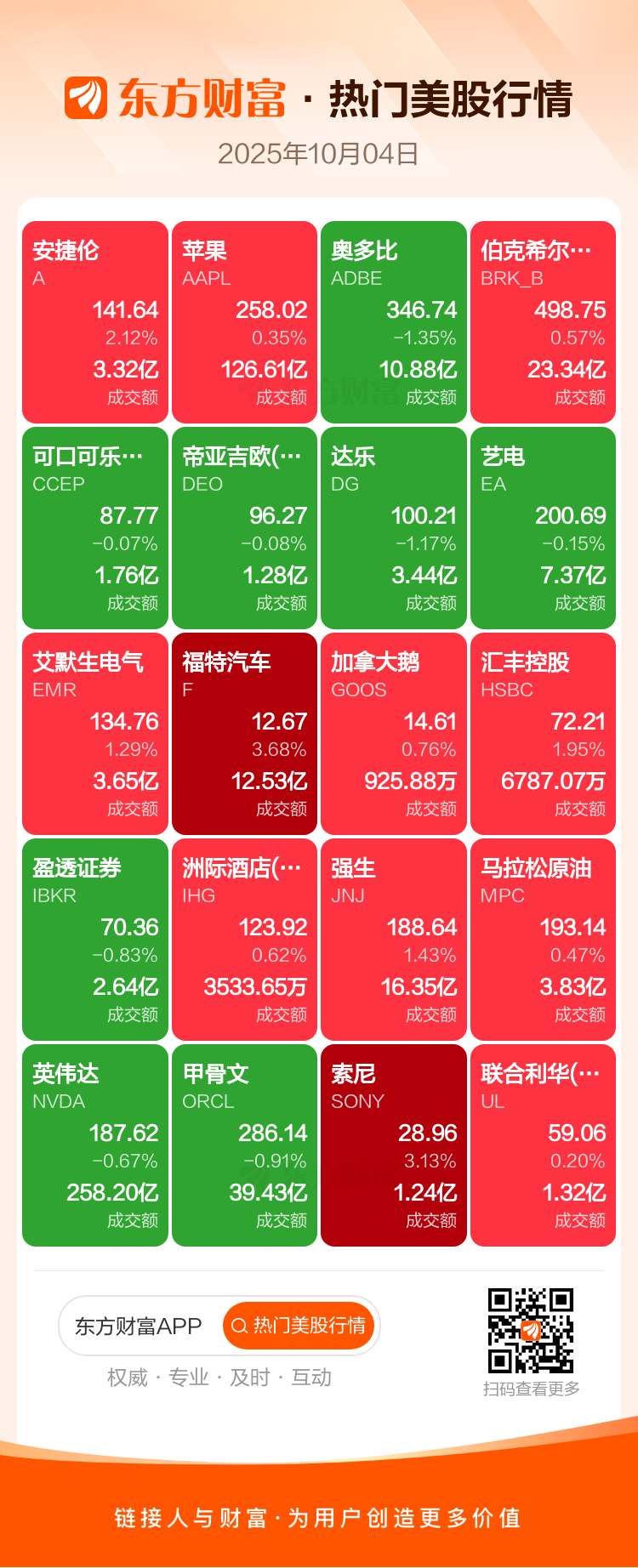 安捷伦涨2.12%,苹果涨0.35%,奥多比跌1.35%,伯克希尔哈撒韦-B涨0.57%,可口可乐欧洲太平洋合伙(US)跌0.07%,帝亚吉欧(US ADR)跌0.08%,达乐跌1.17%,艺电跌0.15%,艾默生电气涨1.29%,福特汽车涨3.68%。
