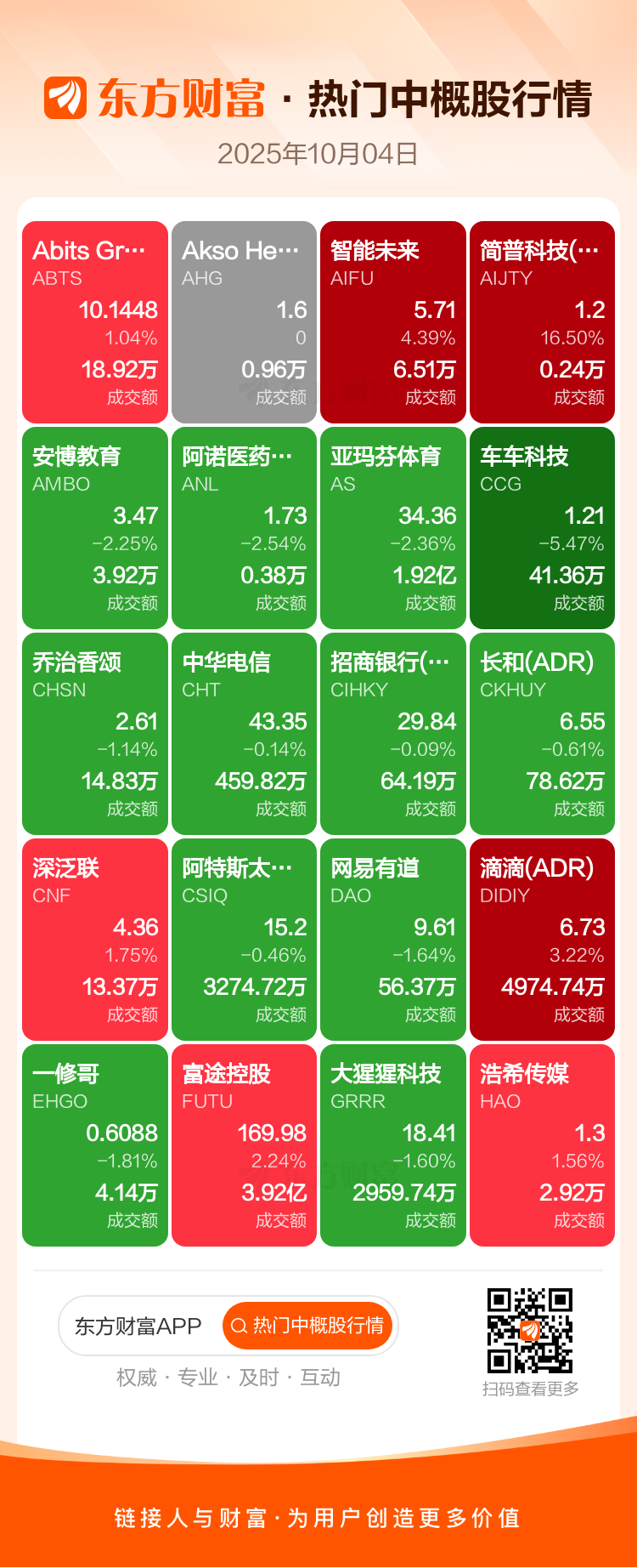 Abits Group Inc涨1.04%,Akso Health Group ADR平收,智能未来涨4.39%,简普科技(ADR)涨16.50%,安博教育跌2.25%,阿诺医药集团跌2.54%,亚玛芬体育跌2.36%,车车科技跌5.47%,乔治香颂跌1.14%,中华电信跌0.14%。