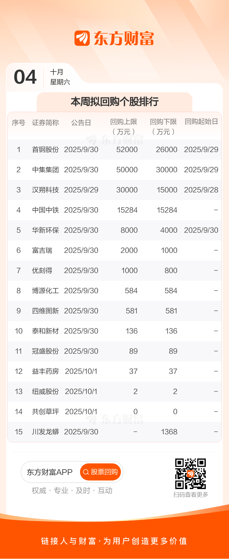 本周有15家公司宣布回购计划,按拟回购金额上限统计,计划回购金额15.97亿元。其中首钢股份拟回购金额上限最高,为5.20亿元。