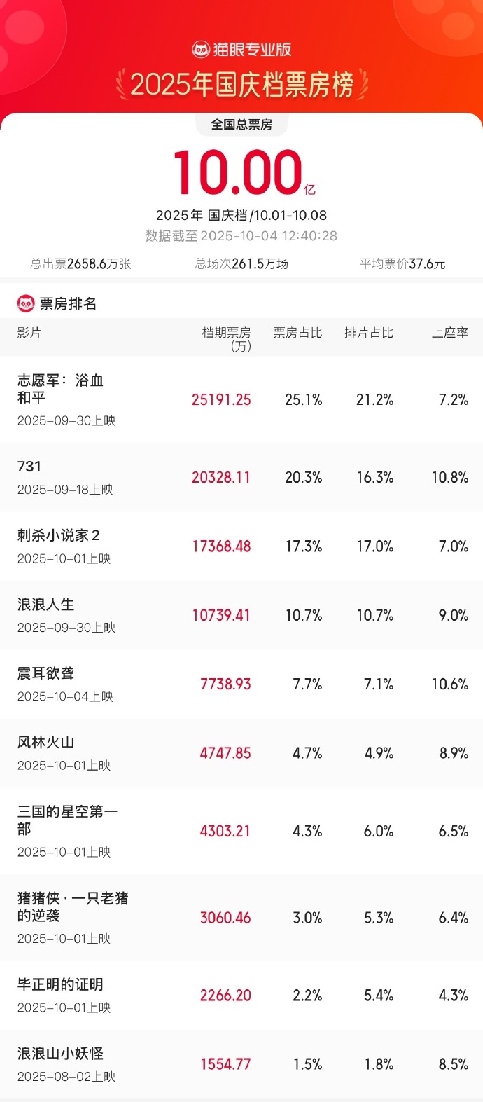 据猫眼专业版数据,截至10月4日12时40分,2025年国庆档档期票房破10亿元,《志愿军:浴血和平》《731》《刺杀小说家2》分列前三位。