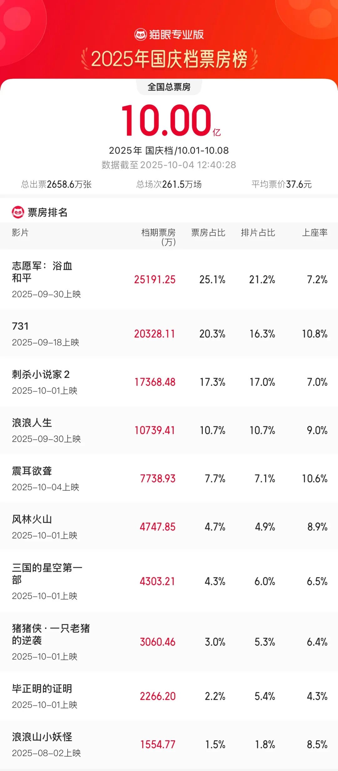 据猫眼专业版数据,截至10月4日12时40分,2025年国庆档档期票房已破10亿元,《志愿军:浴血和平》《731》《刺杀小说家2》分列前三位。