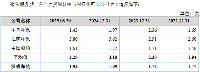 从盈利质量上看,汉盛海装毛利率与高于行业水平。2022~2024年,公司毛利率分别为39.8%、45.56%、48.29%,高于行业均值,但公司存货周转率却低于行业均值。