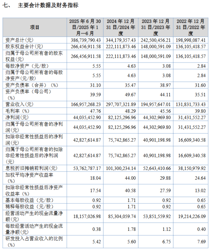 招股书显示,受益于全球造船行业景气周期上行、中国大力扶持海洋装备产业政策等因素影响,公司报告期内业绩呈现快速增长态势。2022年至2024年,公司营业收入分别为1.32亿元、1.95亿元和2.98亿元,年均增长率约40%;净利润分别为3143万元、4430万元和8212万元,2024年同比增长85.37%。