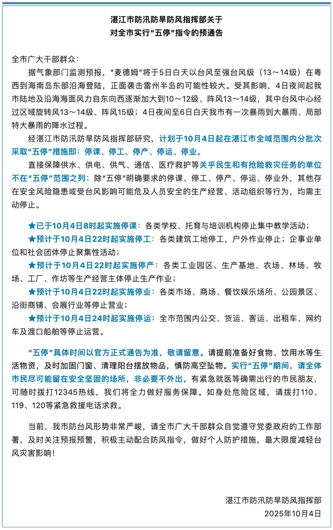 10月4日,广东湛江市防汛防旱防风指挥部发布关于对全市实行“五停”指令的预通告:据气象部门监测预报,“麦德姆”将于5日白天以台风至强台风级(13~14级)在粤西到海南岛东部沿海登陆,正面袭击雷州半岛的可能性较大。受其影响,4日夜间起湛江市陆地及沿海海面风力自东向西逐渐加大到10~12级、阵风13~14级,其中台风中心经过区域旋转风13~14级、阵风15级;4日夜间至6日白天湛江市有一次暴雨到大暴雨、局部特大暴雨的降水过程。经湛江市防汛防旱防风指挥部研究,计划于10月4日起在湛江市全域范围内分批次采取“五停”措施即:停课、停工、停产、停运、停业。实行“五停”期间,请全体市民尽可能留在安全坚固的场所,非必要不外出。