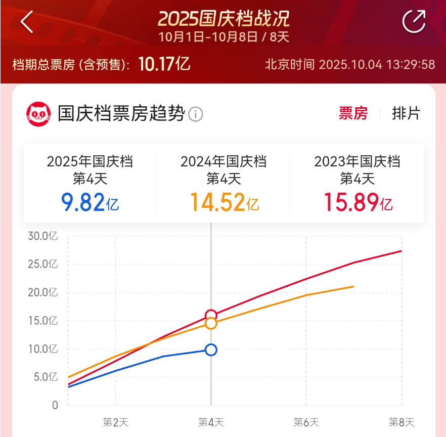 值得一提的是,虽然目前2025年国庆档票房已突破10亿元,但横向对比来看,今年国庆档票房进度明显落后于往年,有待后期持续发力。