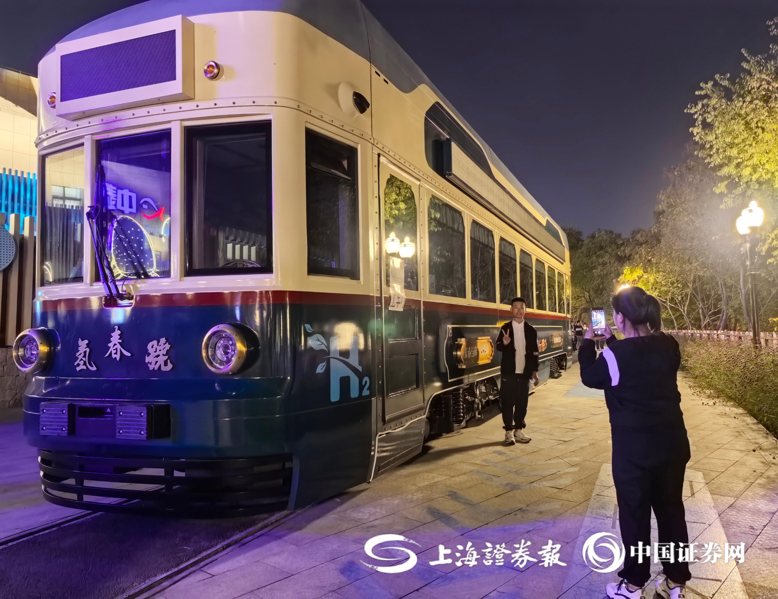 游客在新民大街“氢春号”氢能源轨交文旅列车旁拍照打卡。(田甜摄)