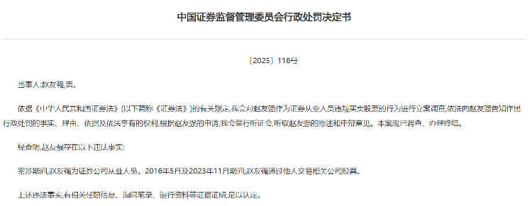 2016年5月及2023年11月期间,赵某强通过他人交易相关公司股票。最终,证监会决定责令赵某强依法处理非法持有的股票,没收违法所得7万元,并处以25.67万元罚款。