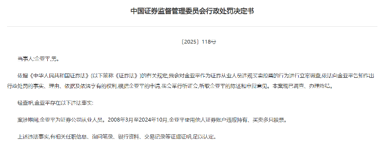 2008年3月至2024年10月,金某平使用他人证券账户违规持有、买卖多只股票。最终,证监会决定没收金某平违法所得500.50万元,并处以500.50万元罚款。