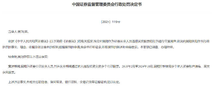 2018年2月至2024年10月,展某控制使用多个他人证券账户持有、买卖多只股票。最终,证监会责令展某依法处理非法持有的股票,并处罚没款共计1.59亿元。