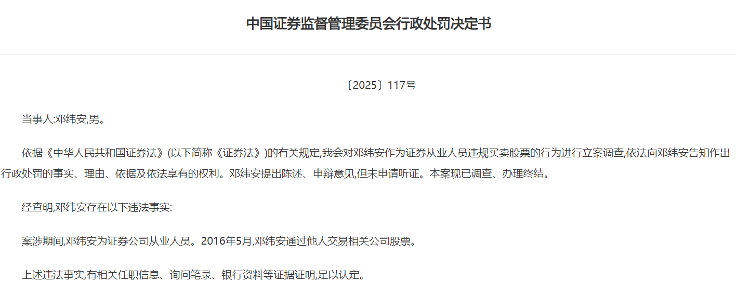 2016年5月,邓某安通过他人交易相关公司股票。最终,证监会责令邓某安依法处理非法持有的股票,没收违法所得17.50万元,并处以35万元罚款。
