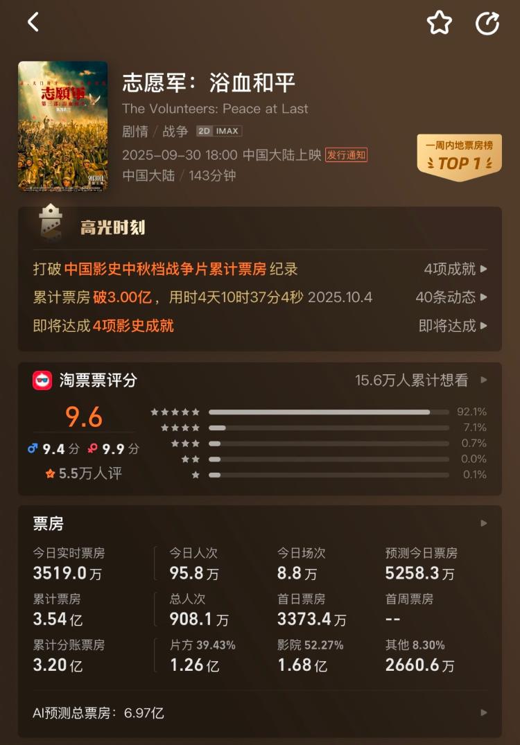 “《志愿军:浴血和平》持续领跑国庆档票房,观众基本盘稳固,其良好的市场表现也为整体票房走势的平稳提供了重要支撑。”10月5日,灯塔专业版数据分析师陈晋在接受海报新闻记者采访时表示,观众画像显示,该片男女观众分布均衡,40岁以上多人结伴观影的比例尤为突出,成为多数家庭观众的观影首选。