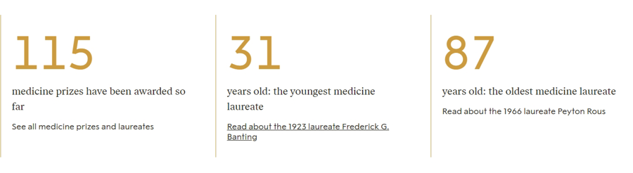 在所有获奖者中,最年轻的得主当属加拿大医生法雷迪·G·班廷爵士,他因发现胰岛素而被授予1923年诺贝尔生理学或医学奖,时年31岁。